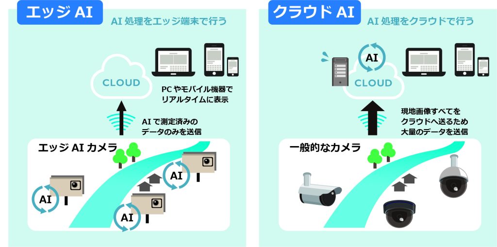 エッジデバイス(エッジは「端」という意味)と呼ばれる端末本体にAIシステムを搭載し、端末内でAIによる解析をする仕組みのことをいいます。エッジデバイス側でAI処理を行うことでタイムラグの少ない判断が可能になるほか、クラウドとの通信量が抑えられ、通信コストの削減、生データをクラウドに送らないことによるセキュリティー保護にもつながります。