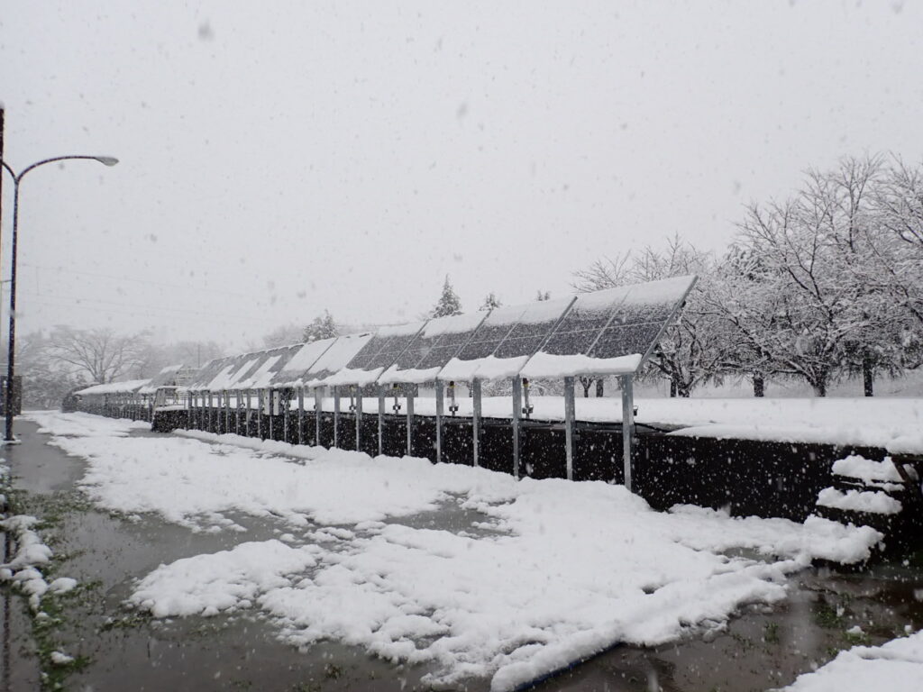 当社もこの実験に参加し、パネルの角度を変えることで積もった雪を落とす「可変型太陽光発電システム」を設置しました。可変型パネルと通常型パネルの発電量比較を行ったところ、可変型でも通常型とほぼ同等の順調な発電が確認できています。システム普及のためには設置場所の制限や使用鋼材のサイズなどまだ検討すべき課題はあるものの、雪国における太陽光発電設備導入の第一歩として、さまざまな知見を得た取り組みとなりました。