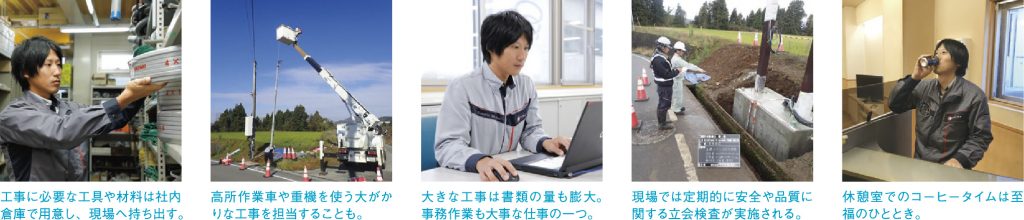 現在、私は地元で展開する大手スー ーの 内装工事と、新潟県内の公共工事で 「現場代理人」を務めています。現場代理人とは、社長を代理して工事の人員・予算・エ期・安全のすべてを管理する立場のことです。スーパーなどの民間 工事は、予算・エ期ともに厳しい反面、照明の選定から配置までコーディネートできる楽しさがあります。公共工事は、実作業よりも事前準備に多くの時間を割きます。例えば、上越・糸魚川・妙高方面の国道の照明を更新した案件では、管内すべての古くなった照明を事細かにリストアップした資料が必要でした。